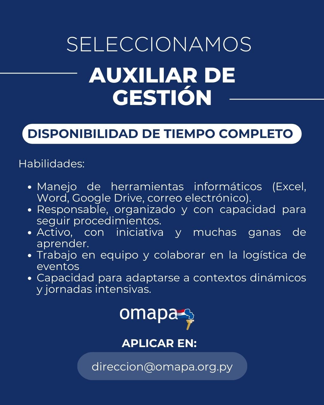 En OMAPA estamos en proceso de selección para cubrir el puesto de Auxiliar de Gestión.